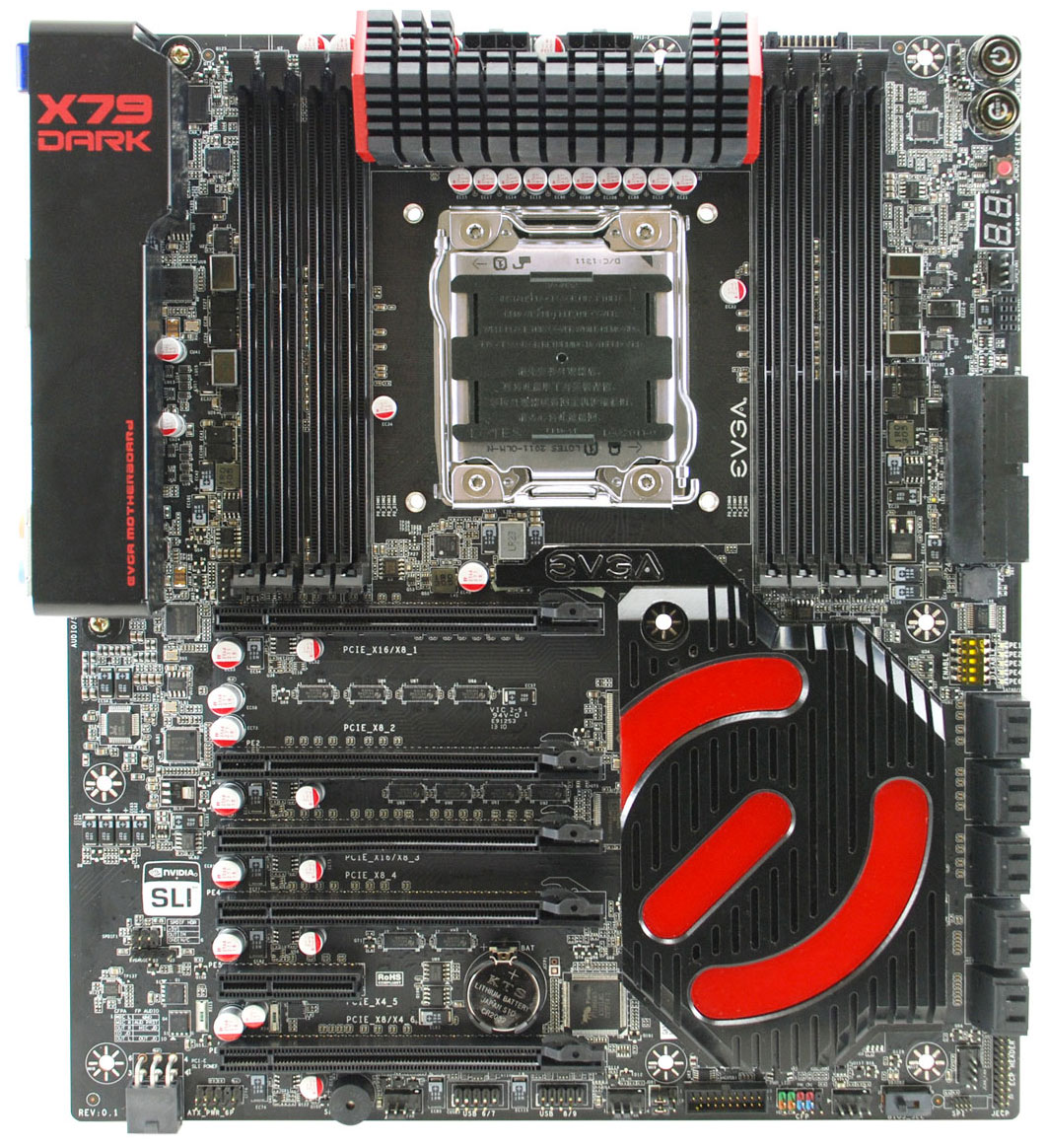 EVGA X79 Dark поддерживает установку любых процессоров в конструктивном исполнении Socket LGA2011, до 64 ГБ оперативной памяти DDR3 с частотой 800—2400 МГц и графических конфигураций 4-Way SLI и 4-Way CrossFireX на скорости 4x8. Подсистема питания гнезда CPU насчитывает 14 (12+2) фаз. Дополнительных разъемов питания несколько: два EPS12V и один PCI-E Power на 6 контактов, распаянный в левом нижнем углу PCB. Для обеспечения стабильности при разгоне и лучшего охлаждения силовых элементов X79 Dark изготовлена на 12-слойной печатной плате.
