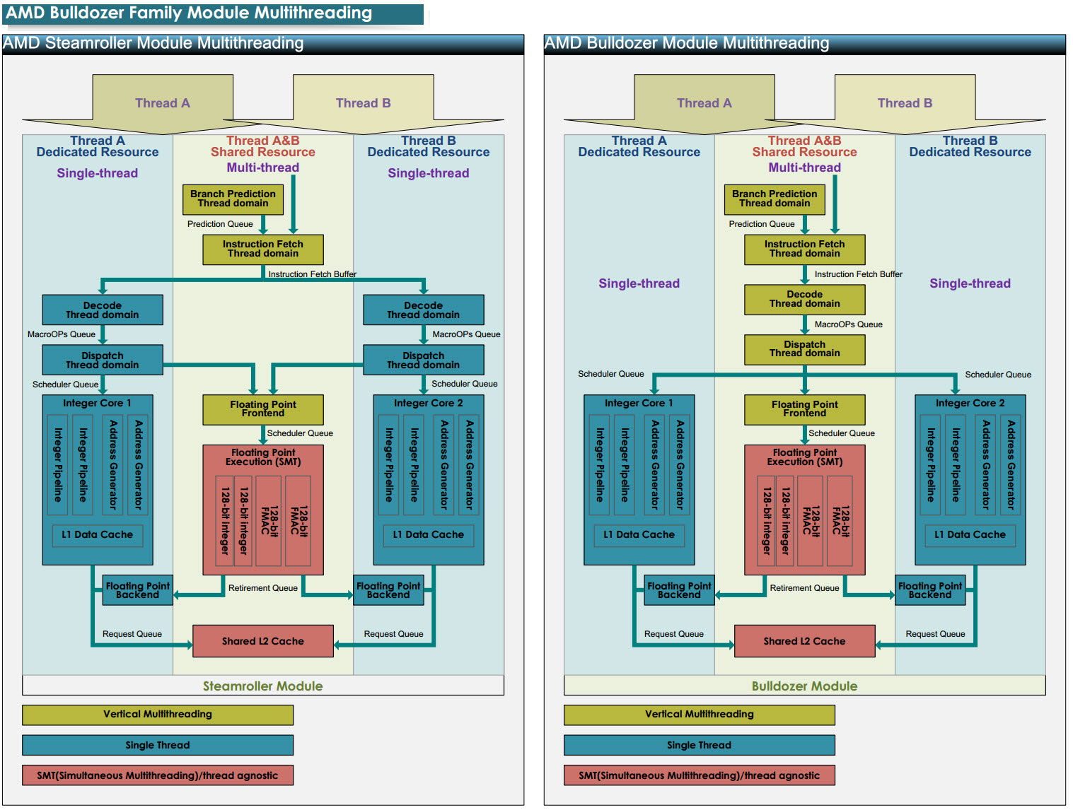 Применение ядер микроархитектуры Steamroller обеспечит 25%-ный прирост выполнения инструкций за такт (IPC) и увеличение производительности в многопоточных приложениях. Кэш-память второго уровня будет индивидуальной для каждого модуля (двух ядер).