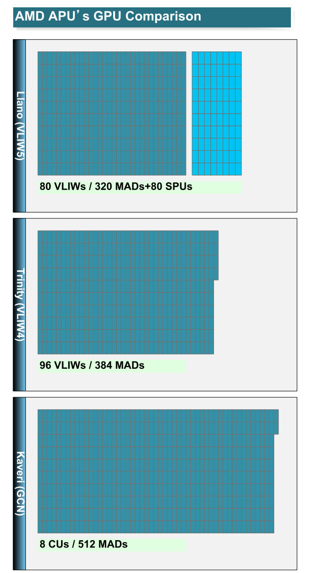 Флагманские модели Kaveri обзаведутся графической подсистемой в составе 512 шейдеров GCN 2.0. Второе поколение Graphics Core Next предложит лучшее сочетание производительности и энергопотребления, нежели первое, и существенно упрочит позиции встроенных видеоускорителей. Разница в быстродействии 384 блоков VLIW4 и 512 блоков GCN 2.0 будет весьма существенной.