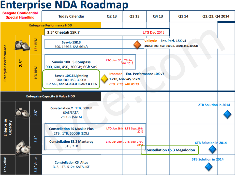 В технологической дорожной карте Seagate числятся 5 ТБ модель Constellation CS Altos и 6 ТБ диск Constellation ES.3 «Megalodon». Их выпуск запланирован на второй-третий квартал 2014 года. Для семейства накопителей с кодовым именем «Megalodon» будут характерны следующие параметры: скорость вращения шпинделя — 5900 об/мин, объем буфера — 64 МБ DDR2, интерфейс — SATA 6 Гбит/с. Количество пластин HDD и плотность записи пока остаются загадкой. Ближе к концу следующего года также выйдет 2,5-дюймовая модель Constellation.2 объемом 2 ТБ. Очевидно, соответствующим образом вырастет и объем 2,5- и 3,5-дюймовых жестких дисков для потребительского рынка.