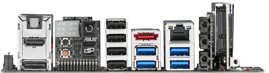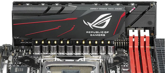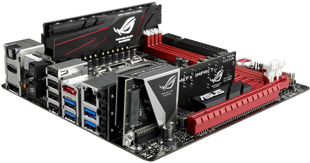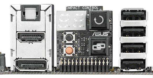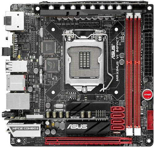 Питание CPU организовано по 10-фазной (8+2) схеме с применением разъема EPS12V и электрических элементов Super Alloy Power. Отметим наличие двух слотов для оперативной памяти DIMM DDR3-1066/.../3000 (до 16 ГБ ОЗУ), единичного PCI Express 3.0 x16, четырех портов SATA 6 Гбит/с (RAID 0, 1, 5, 10), кнопок Power и Reset прямо на плате. Продукт Asus Maximus VI Impact выделяется интеграцией модуля Wi-Fi (802.11ac)/Bluetooth 4.0 с интерфейсом Mini PCI-E, а также 7.1-канальной звуковой карты SupremeFX Impact, оснащенной конденсаторами ELNA и усилителем для наушников. Гигабитная проводная сеть базируется на контроллере Intel I217-V. На задней панели Maximus VI Impact предусмотрены четыре порта USB 3.0, видеовыходы HDMI и DisplayPort, и другие разъемы.