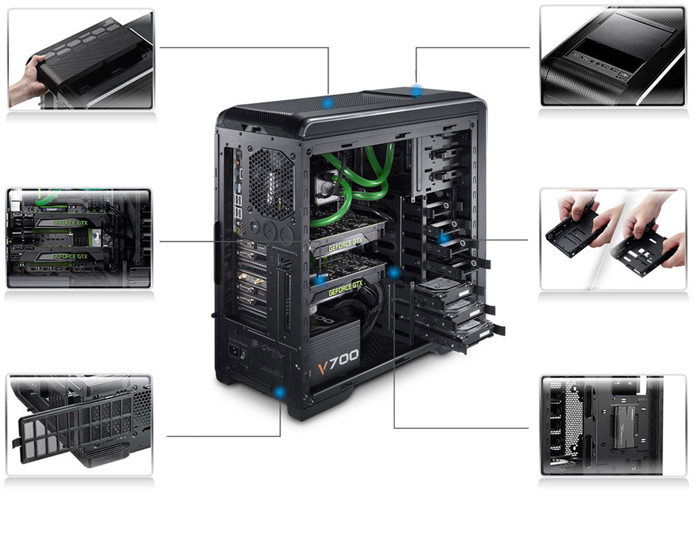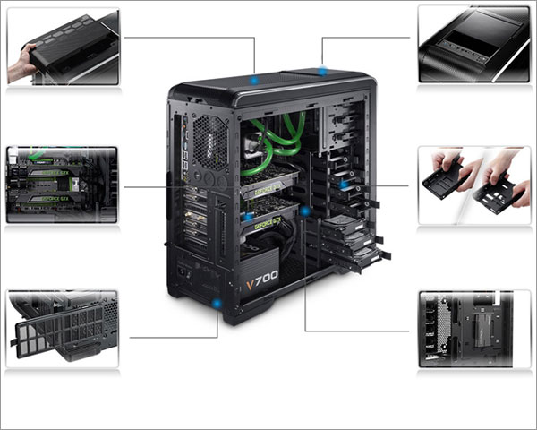 Корпус оснащен пылезащитными фильтрами, отверстиями для укладки кабелей и подводки шлангов СВО, индивидуальными лотками для накопителей и приспособлениями для безвинтового крепления устройств форм-фактора 5,25".