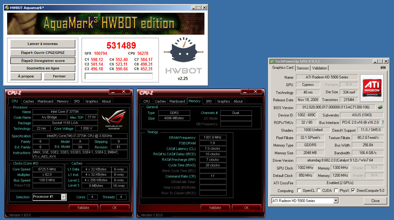 Тестовый стенд включал, собственно, видеокарту Asus Ares со штатным охлаждением, разогнанную до 1002/5200 МГц (ядро/память), а также «замороженный» жидким азотом четырехъядерный процессор Intel Core i7-3770K (частота 6725 МГц), материнскую плату Asus Maximus V Extreme на чипсете Z77, 4 ГБ (2 x 2 ГБ) оперативной памяти DDR3 @2604 МГц и 1200-ваттный блок питания.