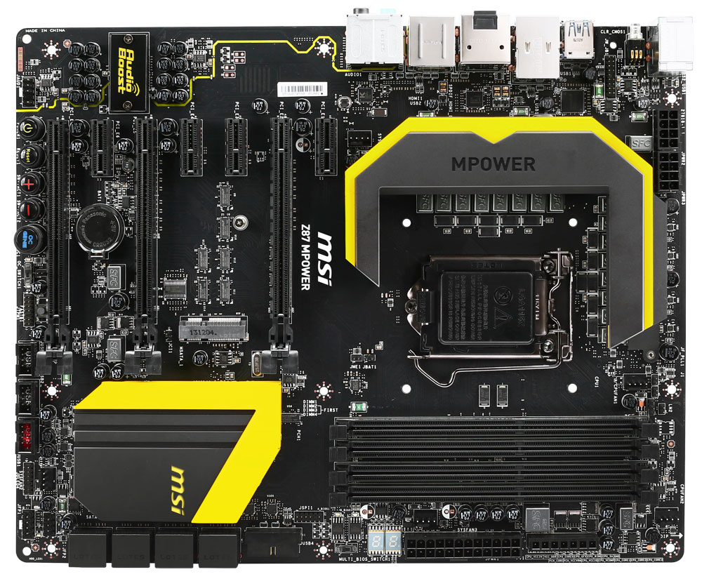 Отметим наличие восьми каналов USB 3.0 (6 портов на задней панели + коннектор на плате), 7.1-канального аудиокодека Realtek ALC1150, сетевого контроллера Killer E2205 и различных оверклокерских «примочек»: контактов для измерения напряжений V-Check Points, кнопок управления питанием и частотой BCLK, клавиши OC Genie 4, переключателя OC Switch и индикатора POST-кодов. Сравнительные характеристики материнских плат Z87 MPower SP, Z87 MPower и Z87 MPower Max приведены по ссылке.
