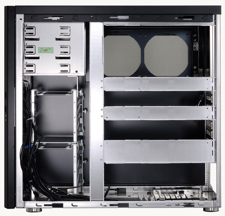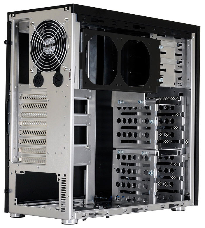 Внутри можно установить материнскую плату одного из форм-факторов — ATX, microATX или Mini-ITX, процессорный кулер высотой до 155 мм, восемь карт расширения PCI Express длиной до 300/440 мм (с корзиной для HDD либо без таковой), ATX-совместимый блок питания длиной до 300 мм, шесть 3,5-дюймовых и два 2,5-дюймовых накопителя данных, а также три устройства форм-фактора 5,25" и шесть 120-мм вентиляторов. Два «пропеллера» означенного типоразмера входят в комплект поставки.