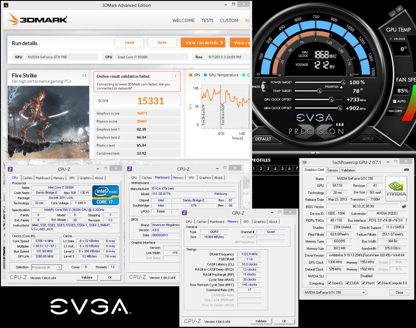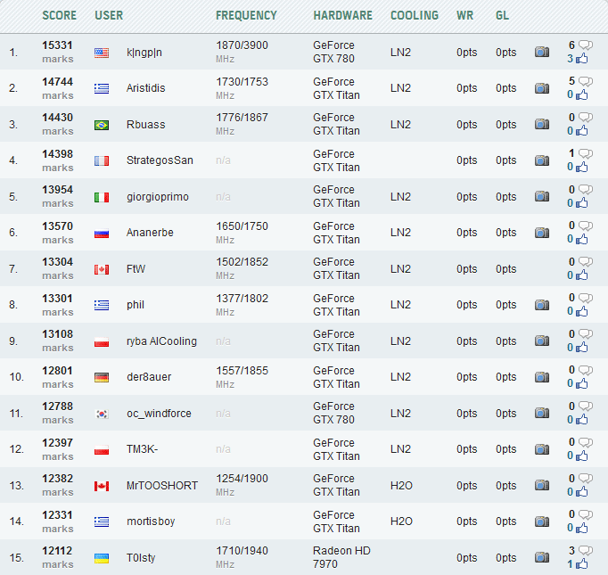Имея в своем распоряжении отборный образец видеокарты EVGA GeForce GTX 780 Classified, известный оверклокер Винс «k|ngp|n» Люсидо обошел ближайшего конкурента в бенчмарке 3DMark Fire Strike на 587 очков. Результат американца — 15331 «попугай». В состав стенда вошли: материнская плата EVGA X79 Dark, шестиядерный процессор Intel Core i7-3930K (@5706 МГц), 16 ГБ (4 x 4 ГБ) оперативной памяти G.Skill TridentX DDR @2446 МГц, два блока питания EVGA SuperNova NEX 1500 и вышеупомянутый видеоускоритель EVGA GeForce GTX 780 Classified, разогнанный до 1868/7812 МГц для ядра и памяти соответственно. Центральный и графический процессоры охлаждались жидким азотом («стаканы» KingpinCooling Dragon F1 Gemini и Tek-9 Fat).