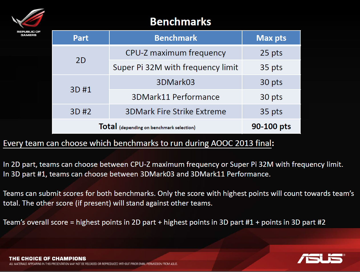 Впервые, если память не изменяет, оверклокеры смогут делать выбор среди соревновательных дисциплин. Обязательным станет лишь бенчмарк 3DMark Fire Strike Extreme. Предпочтя тест SuperPi 32M менее трудоемкому CPU-Z Max Frequency (максимальная частота CPU), участники будут бороться за большее количество очков.