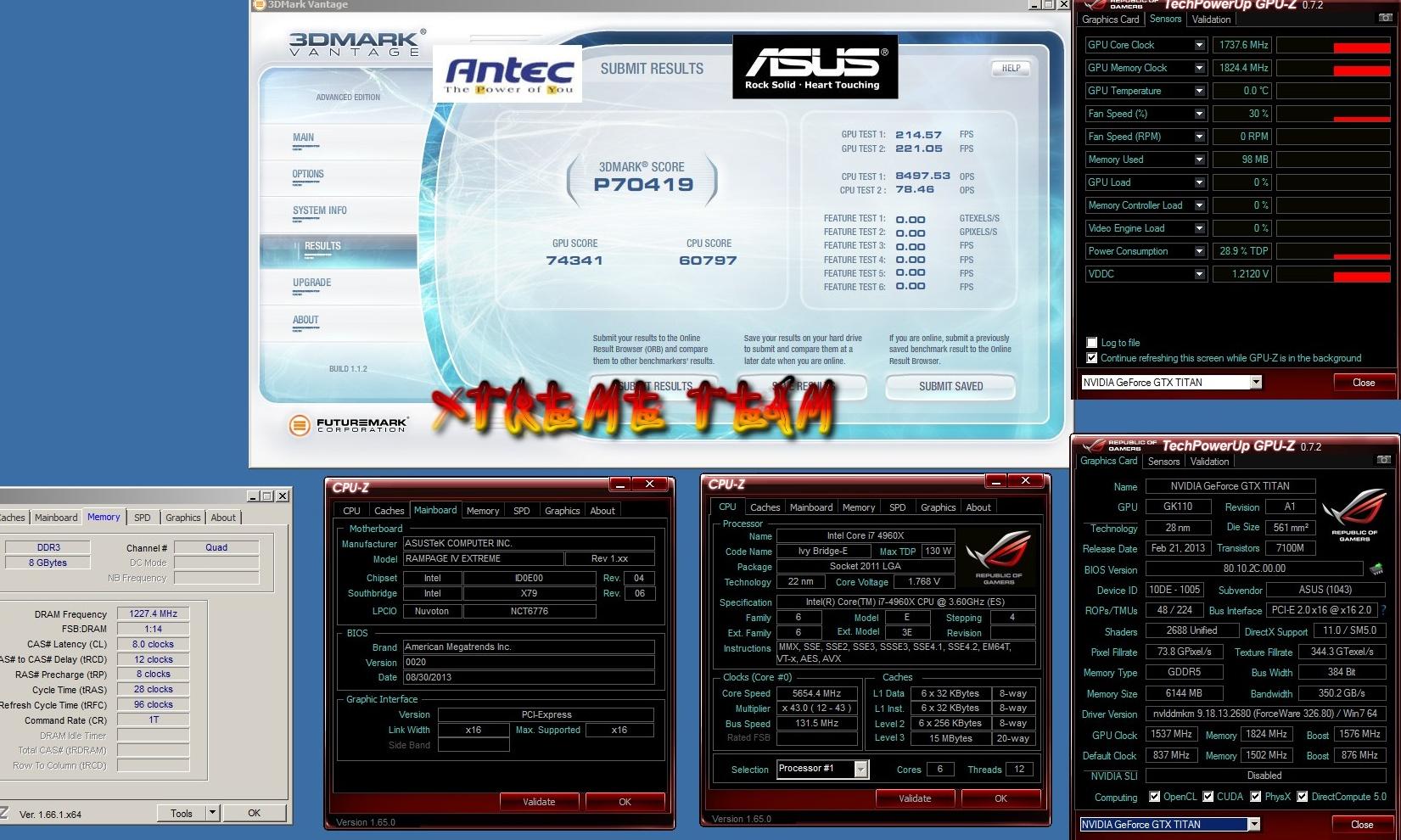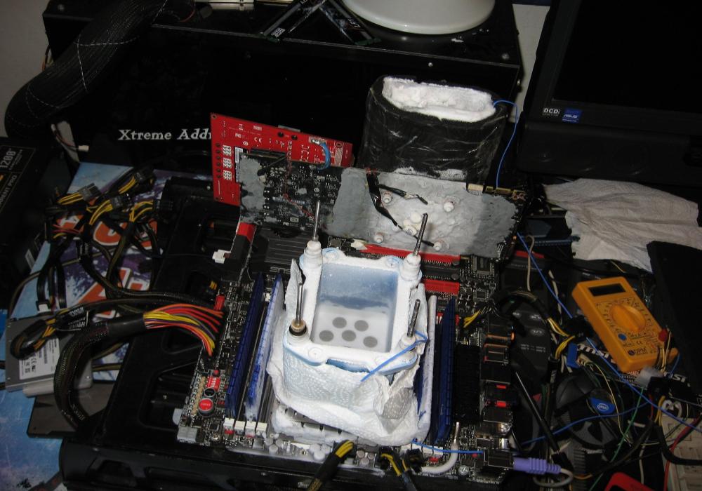 Разгон видеокарты Asus GeForce GTX Titan составил 1737/7298 МГц (ядро/память), процессор Intel Core i7-4960X смог работать на частоте 5654 МГц (43x 131,5 МГц) при 1,77 В, четыре планки оперативной памяти Kingston HyperX функционировали в режиме DDR3-2455. В число компонентов тестового стенда также вошли: материнская плата Asus Rampage IV Extreme на чипсете X79, блок питания Antec HCP-1200, твердотельный накопитель Kingston HyperX 3K 256 ГБ и испарители для жидкого азота.
