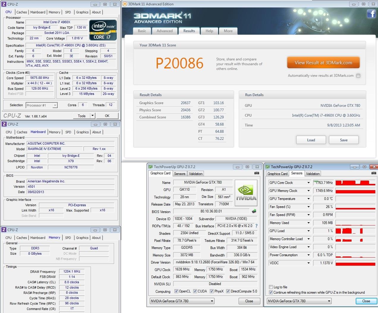 В составе стенда также были задействованы: материнская плата Asus Rampage IV Extreme (чипсет X79), шестиядерный процессор Intel Core i7-4960X @5675 МГц, 8 ГБ (4x 2 ГБ) оперативной памяти G.Skill RipjawsX DDR3 @2408 МГц, SSD-накопитель марки Intel и блок питания Antec HCP Platinum 1300W.