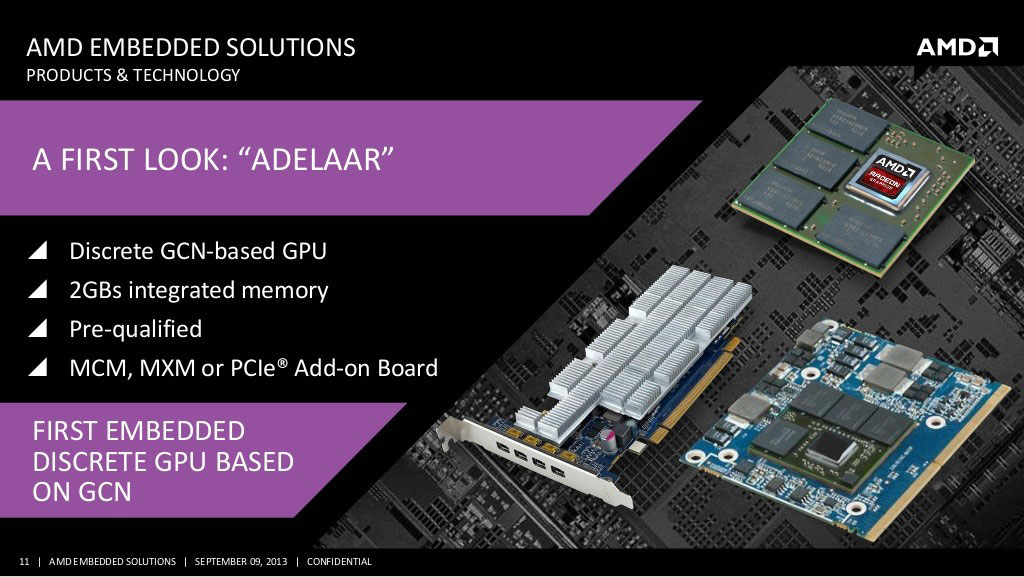 Перечень устройств AMD Embedded Solutions замыкает Adelaar — видеоадаптер на основе микроархитектуры Graphics Core Next, оборудованный 2 ГБ буферной памяти с пропускной способностью 72 ГБ/с (эффективная частота — 4500 МГц). Он выйдет в форматах PCI Express, MCM и MXM. Карта будет поддерживать API DirectX 11.1, OpenGL 4.2 и многомониторные конфигурации.