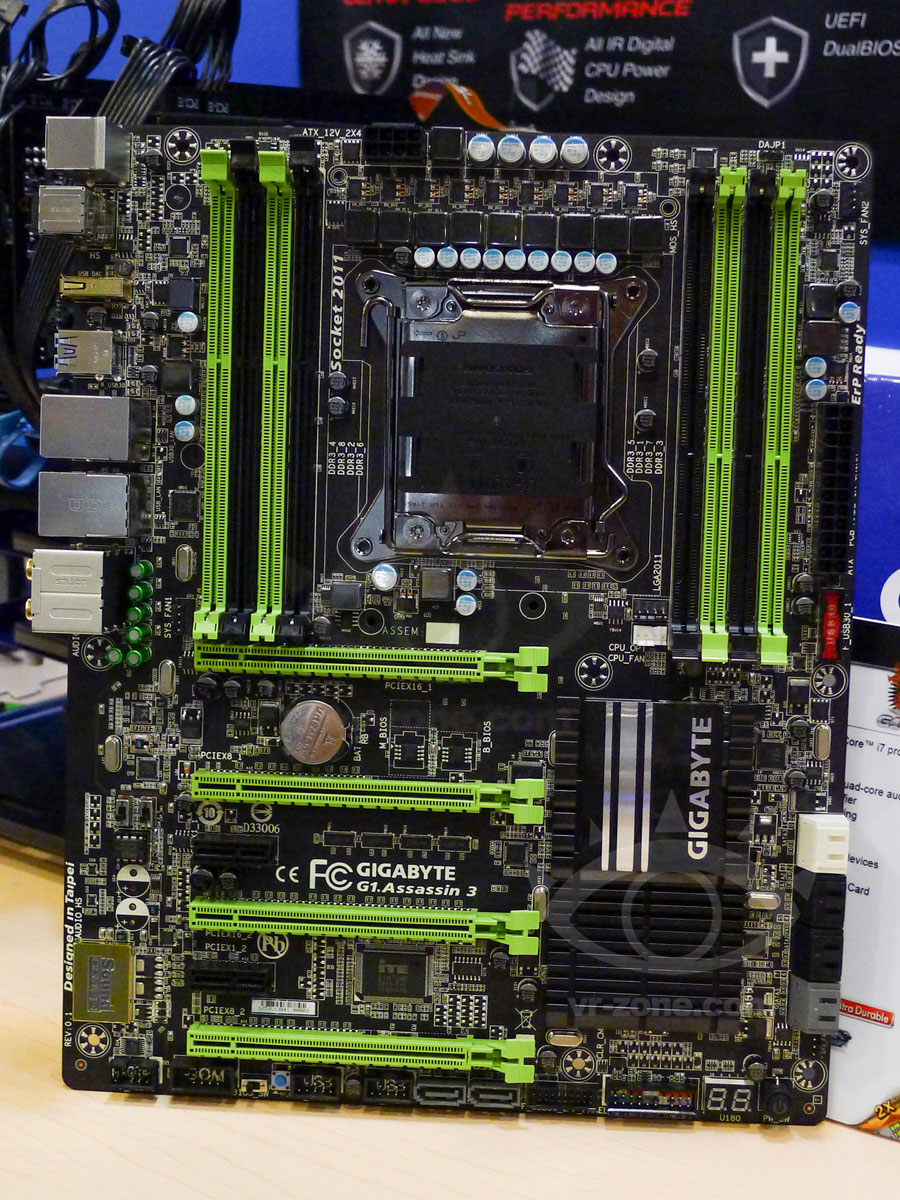 В арсенале G1.Assassin 3 также имеется 9-фазная система питания сокета LGA2011 (поддерживаются процессоры Core i7-3000/4000), восемь слотов для оперативной памяти DDR3, пара разъемов PCI-E 2.0 x1, шесть портов SATA 6 Гбит/с и четыре SATA 3 Гбит/с. Дополнительное питание обеспечивают разъемы EPS12V и ATX12V, которые находятся у верхнего края платы.
