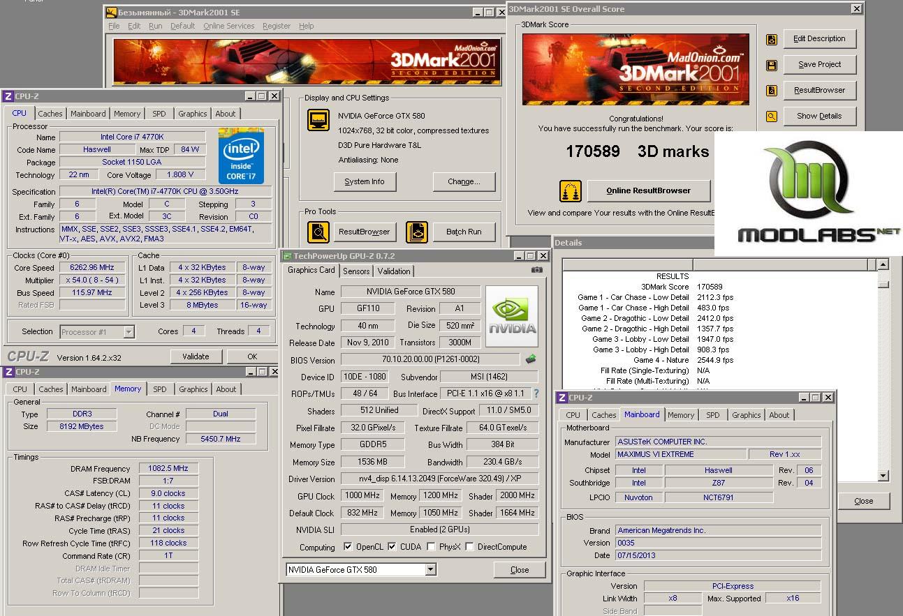 Четырехъядерный Haswell работал на частоте 6262 МГц при напряжении 1,81 В; технология Hyper-Threading была отключена. Карты MSI Lightning разгонялись до 1000/2000/4800 МГц (ядро/шейдерный домен/память), модули оперативной памяти Corsair Dominator DDR3-2400 работали на эффективной частоте 2165 МГц. В состав стенда входила материнская плата Asus Maximus VI Extreme (на чипсете Intel Z87), также использовались 1200-ваттный блок питания марки Corsair и «стакан» для жидкого азота KingpinCooling Dragon F1 Gemini.