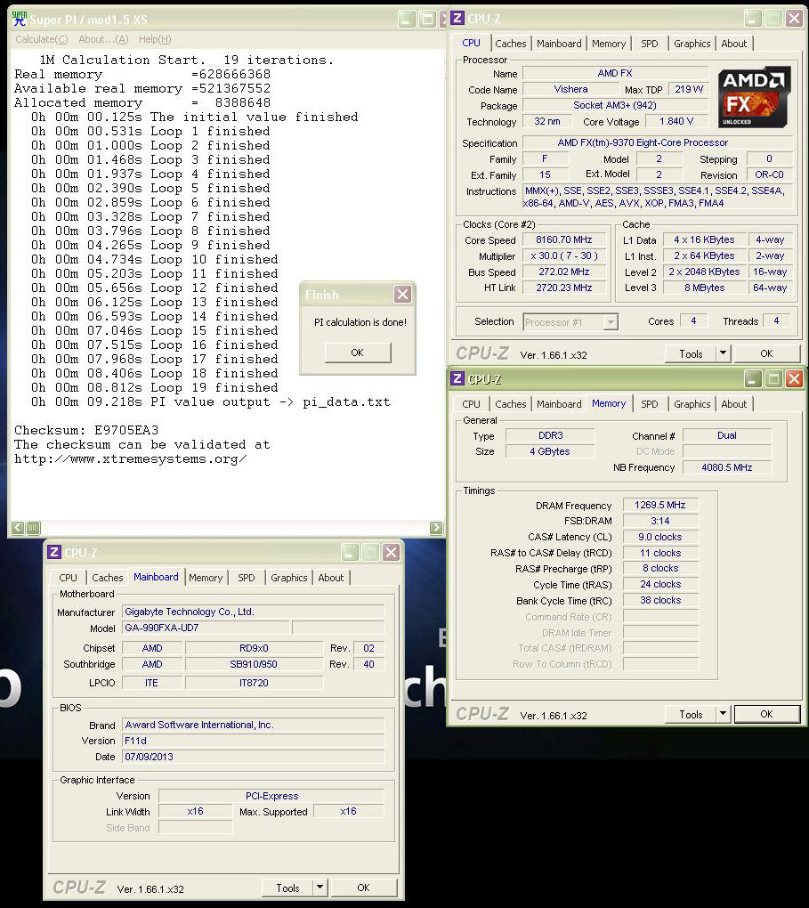 Так или иначе, призы от организаторов получили многие участники, ну а настоящим украшением последнего дня Gigabyte «Pi is Returned» стал рекорд в SuperPi 1M для платформ AMD в исполнении The Stilt — 9,218 с. Этот парень по-настоящему крут: его восьмиядерный процессор AMD FX-9370 смог пройти тест на частоте 8160 МГц при напряжении 1,84–1,93 В и температуре –180 °C.