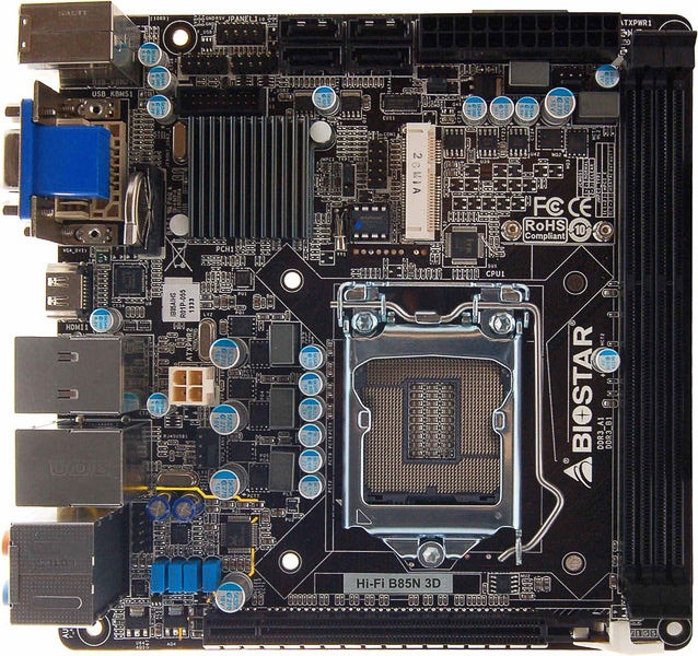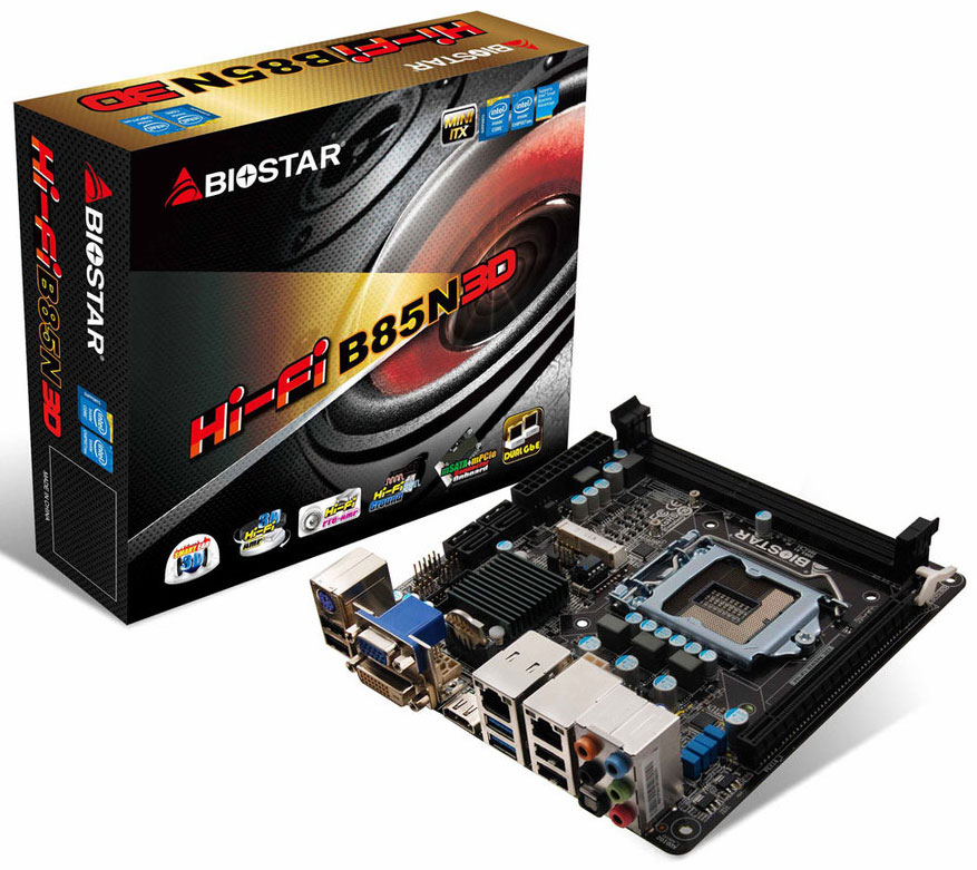 На задней панели Biostar Hi-Fi B85N 3D находятся интерфейсы PS/2 (для клавиатуры), DVI-D, HDMI, D-Sub, по паре USB 3.0, USB 2.0 и RJ-45, оптический S/PDIF и пять разъемов Mini-Jack. Цена новинки станет известна позже.