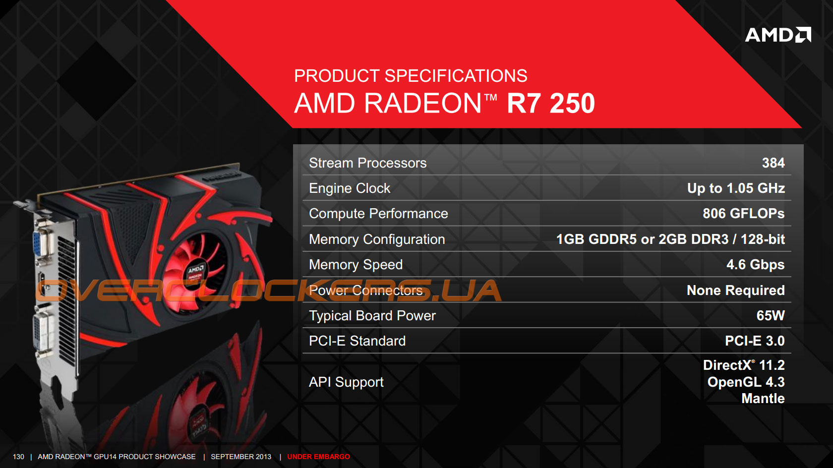 Кроме трио видеоускорителей Radeon R9 280X/R9 270X/R7 260X, AMD предоставит фанатам возможность приобрести карты Radeon R7 250 и Radeon R7 240. Первая базируется на чипе Oland XT, который включает в себя 384 потоковых процессора и 128-битную шину памяти, сообщающуюся с 1 ГБ ОЗУ типа GDDR5 или с 2 ГБ DDR3. Вторая использует кристалл Oland Pro (320 шейдеров, шина памяти 128 бит) и буферную память GDDR5 в объеме 1 ГБ или DDR3 в объеме 2 ГБ. Рекомендованная цена видеокарты Radeon R7 250 составляет около $90, стоимость младшего Radeon R7 240 — около $60.