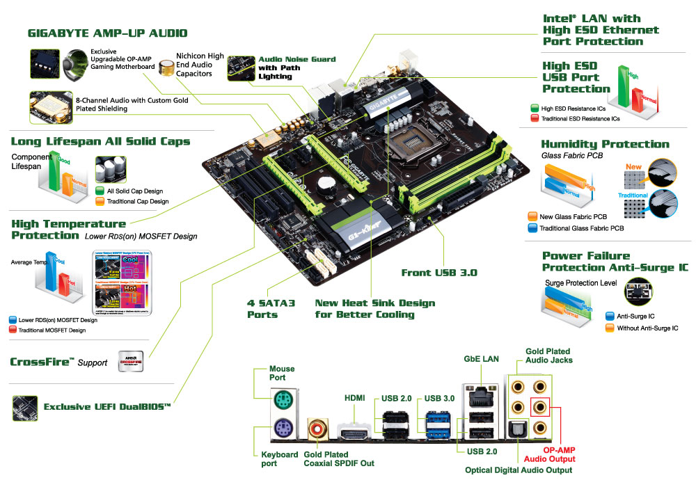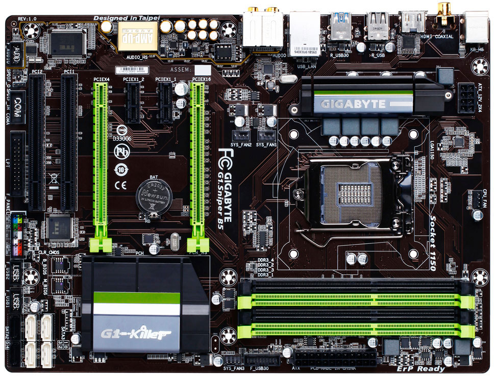 Дебютные платы Gigabyte серии G1 имели широкий функционал, но и стоили отнюдь не дешево. Для желающих приобрести одну из геймерских моделей за умеренную цену (около €85) тайваньская компания предлагает новинку G1.Sniper B5 на основе набора системной логики Intel B85 и процессорного разъема LGA1150. Ключевым преимуществом данного продукта является составляющая Amp-Up Audio: 7.1-канальный аудиокодек Realtek ALC898, заменяемый (upgradable) усилитель для наушников, защищенный от помех аудиотракт с LED-подсветкой, конденсаторы Nichicon и позолоченные разъемы Mini-Jack.