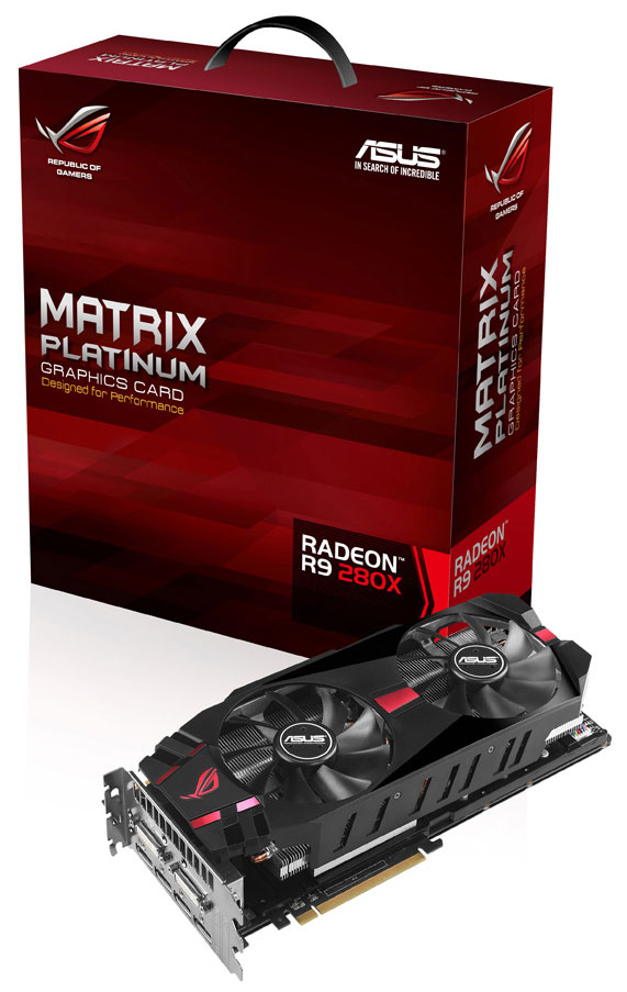 Слухи о пониженных частотах относительно карт HD 7970 подтвердились: адаптеры Matrix R9 280X медленнее в номинальном режиме работы, правда, ненамного. Так, Matrix-R9280X-3GD5 работает на частотах 1000/6000 МГц соответственно для ядра и памяти, а «платиновый» Matrix-R9280X-P-3GD5 — на 1100/6400 МГц. Надеемся, что разгонный потенциал видеокарт Asus Matrix R9 280X/280X Platinum будет не хуже, чем у предшественников.