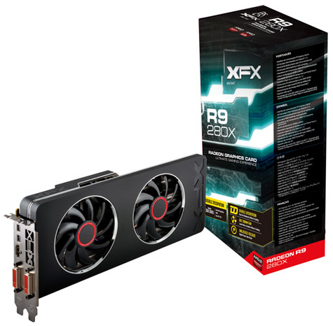 Для карты XFX Radeon R9 280X Double Dissipation характерны: наличие двухслотового кулера с шестью медными тепловыми трубками и парой 100-мм вентиляторов, 3 ГБ буферной памяти и частотная формула 850(1000)/6000 МГц (GPU/память). На задней панели доступны цифровые видеовыходы DL DVI-I, SL DVI-D, HDMI 1.4a и два Mini DisplayPort 1.2.