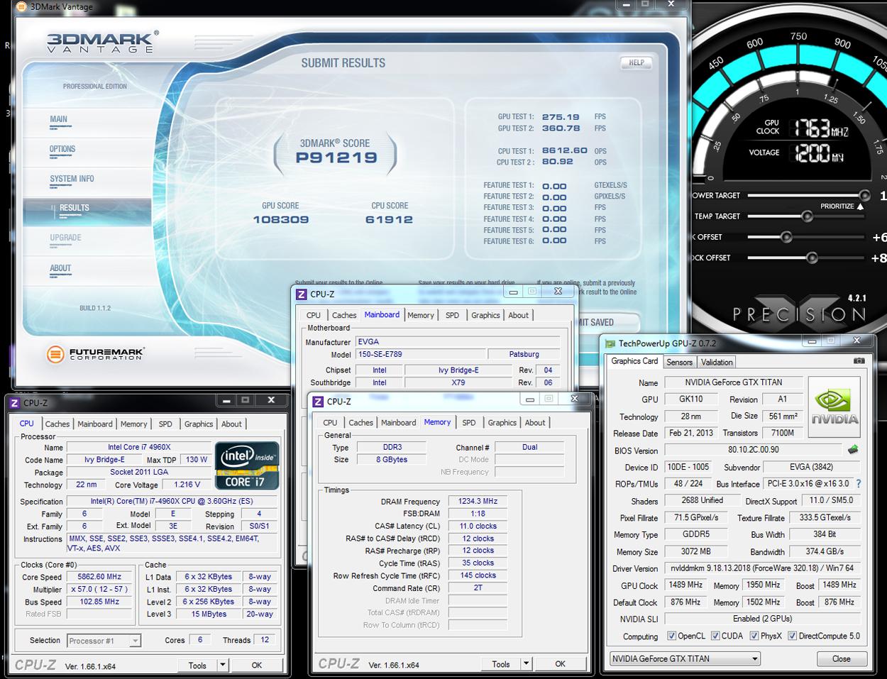 Успех k|ngp|n, кроме пары разогнанных до 1780/7800 МГц (ядро/память) карт Titan, обеспечили: шестиядерный процессор Intel Core i7-4960X, работавший на частоте 5863 МГц, материнская плата EVGA X79 Dark, двухканальный комплект оперативной памяти G.Skill TridentX DDR3 @2469 МГц и 1500-ваттный блок питания марки EVGA. Эксперименты проводились совместно с «Tinbo», он же TiN — участник команд Pure и KPC Pro OC.