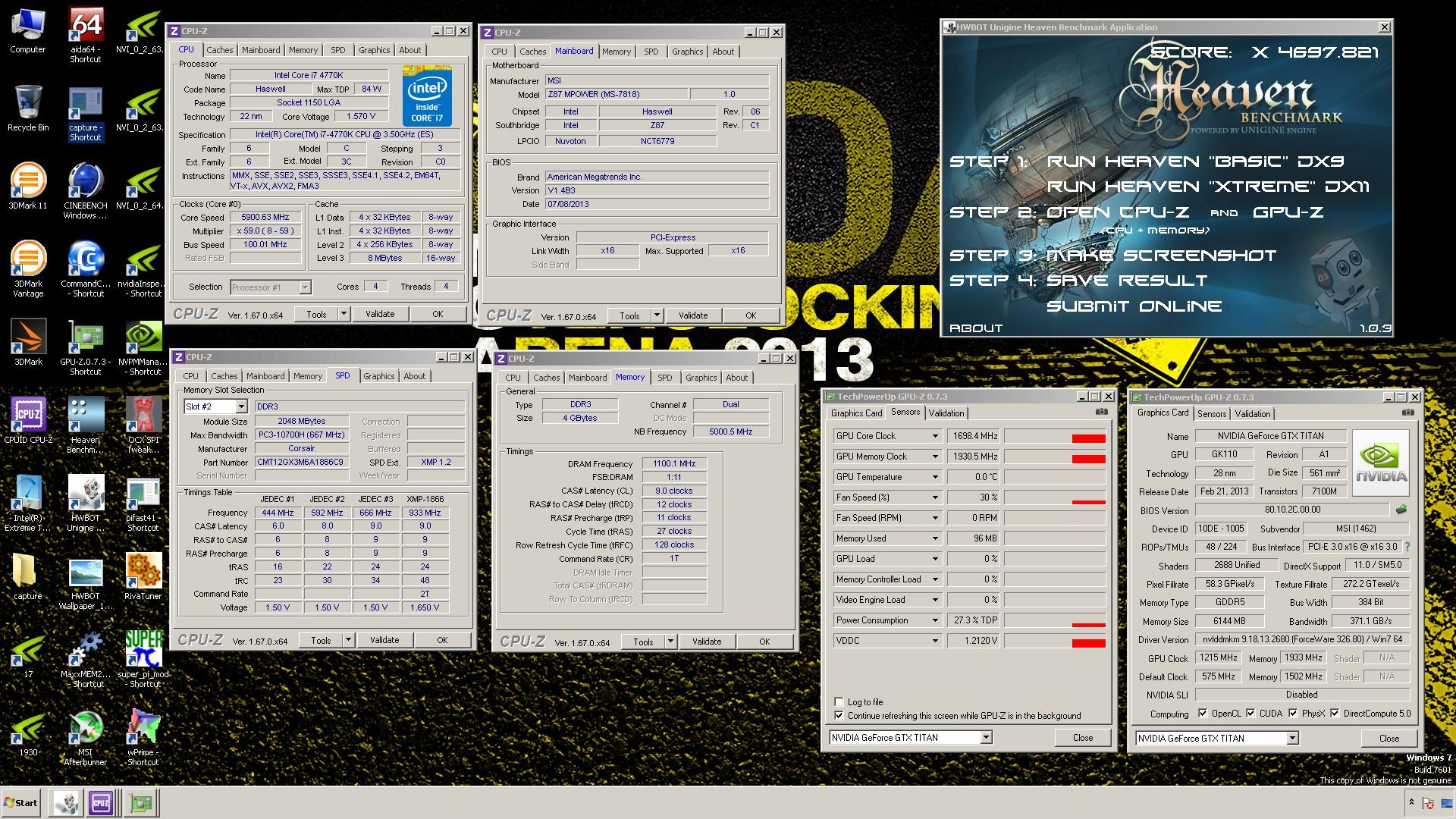 Роналдо Буассали (Rbuass, на фото в центре) обновлял рекордный результат целых пять раз — энтузиазм, безусловно, заслуживающий уважения. Он использовал материнскую плату MSI Z87 MPower Max, разогнанный до 5,9 ГГц процессор Intel Core i7-4770K (с отключенным Hyper-Threading), 4 ГБ (два модуля по 2 ГБ) оперативной памяти Corsair Dominator GTX DDR3 @2200 МГц, видеокарту MSI GeForce GTX Titan (@1698/7722 МГц) и блок питания Cooler Master Silent Pro M2.