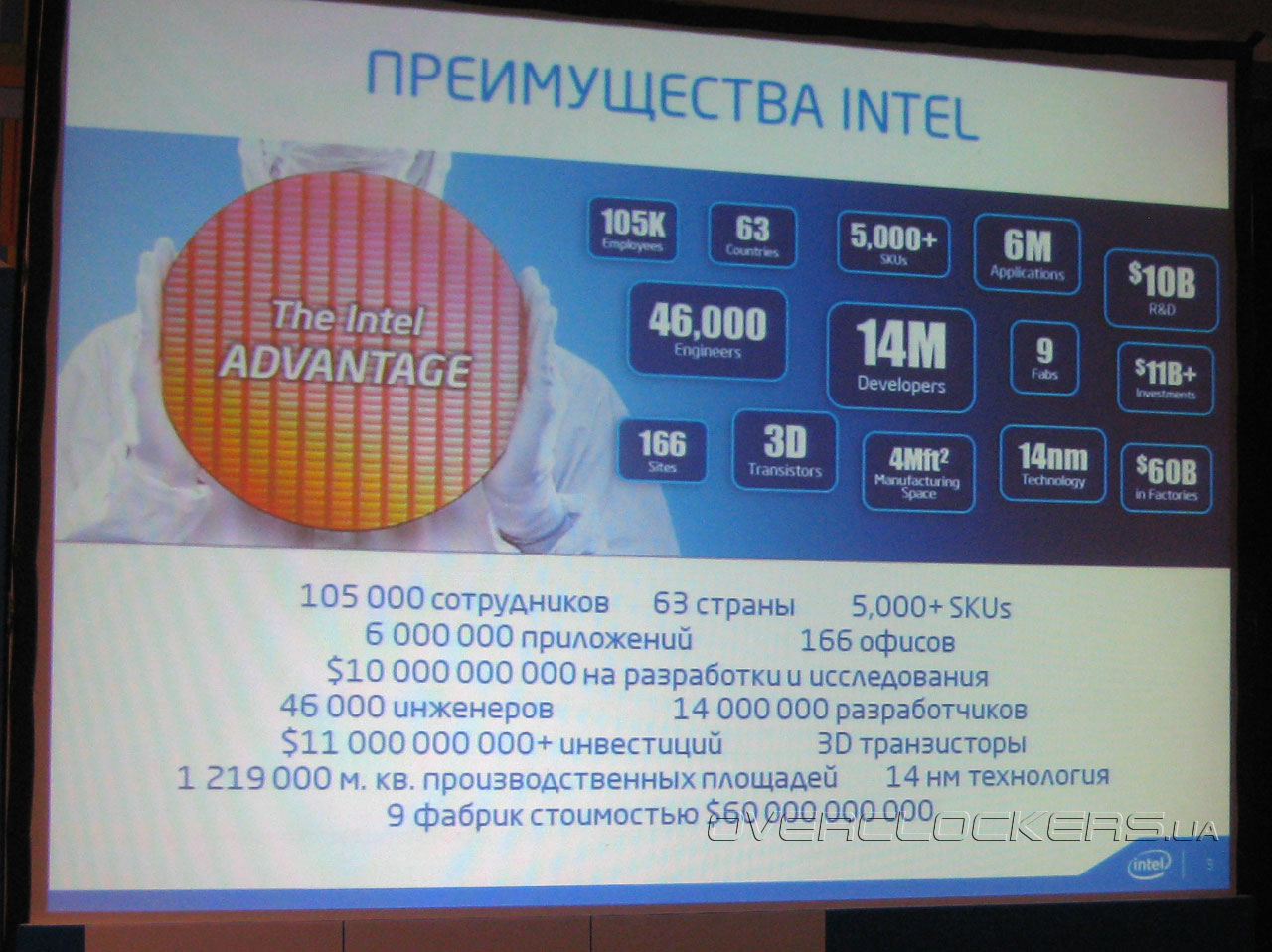 Помимо выступлений Кшиштофа Йонака и Яна ван Влита, прошедший в начале недели McAfee & Intel Day (MID) принес немало интересного. Андрей Матвеев, директор по маркетингу корпорации Intel в России и странах СНГ, обнародовал свежую статистику, согласно которой предприятие владеет девятью фабриками стоимостью 60 млрд. долларов и располагает 46 тысячами инженеров (штат Intel в 2012 г. — 104,7 тыс. сотрудников). Также корпорация обменивается опытом с 14 миллионами разработчиков.