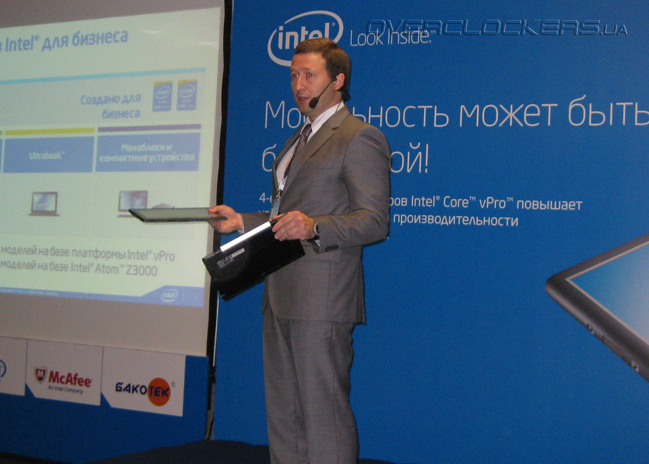 Доклад специалиста по корпоративным технологиям Intel в России и СНГ Александра Мельникова был посвящен современным компьютерам для бизнеса и технологии Intel vPro. По мнению г-на Мельникова, для бизнес-систем сегодня важен не только функционал, но и удобство обращения, как, к примеру, с планшетами iPad, обладающими высоким быстродействием и мультисенсорным экраном.