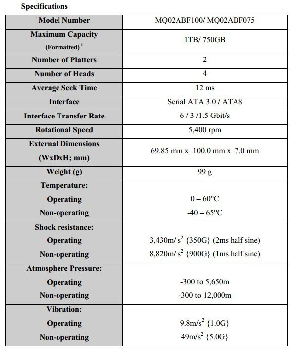 Будучи тоньше большинства мобильных винчестеров, устройства Toshiba MQ02ABF075 и MQ02ABF100 имеют солидный объем дискового пространства для записи данных (соответственно 750 и 1000 ГБ). Оба накопителя оборудуются двумя алюминиевыми пластинами и четырьмя головками, скорость вращения шпинделя составляет 5400 об/мин, среднее время поиска — 12 мс. Разъемом подключения служит привычный SATA 6 Гбит/с. В рабочем режиме диски не должны разогреваться выше 60 °C.