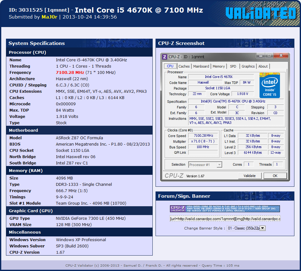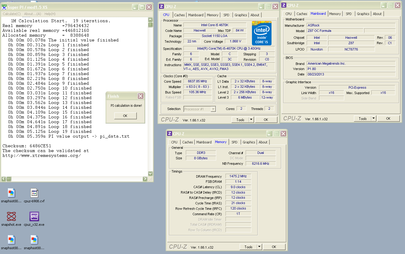 Кроме CPU-Z, Александр показал достойные результаты в PiFast (9,97 с., 5 место в мире) и SuperPi 1M (5,359 с., 1 место среди Core i5-4670K). Отборный процессор Haswell при этом работал на частоте 6,6 ГГц, оперативная память — в режиме DDR3-2950 с таймингами 9-12-12-21 и Command Rate 1T.