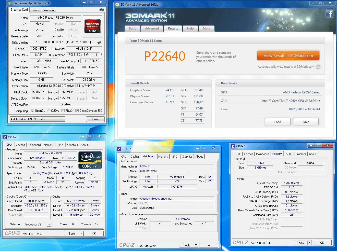 Графический и центральный процессор охлаждались посредством жидкого азота. Стенд включал материнскую плату ASRock X79 Extreme6, шестиядерный Intel Core i7-4960X @6 ГГц, четыре 4 ГБ модуля оперативной памяти DDR3 @2400 МГц, карту Radeon R9 290X от производителя MSI и 1300-ваттный блок питания Antec серии HCP Platinum.