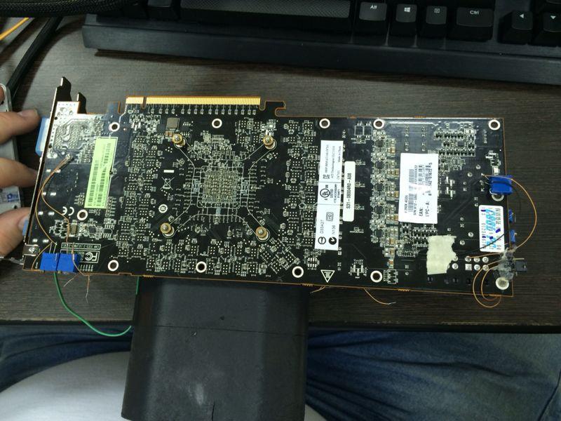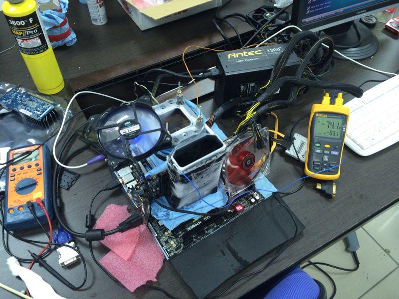 Пребывая на тайваньской земле, российский оверклокер Владимир «Smoke» Георгиев воспользовался гостеприимностью коллеги NickShih, который организовал небольшую бенч-сессию в офисе ASRock. Целью эксперимента было выяснить разгонный потенциал одиночной видеокарты Radeon R9 290X референсного дизайна. После ряда аппаратных модификаций (см. фото ниже) старший Hawaii смог пройти тест 3DMark 11 с результатом 22640 очков при частоте ядра 1500 МГц. Память GDDR5 работала на «эффективных» 7048 МГц.