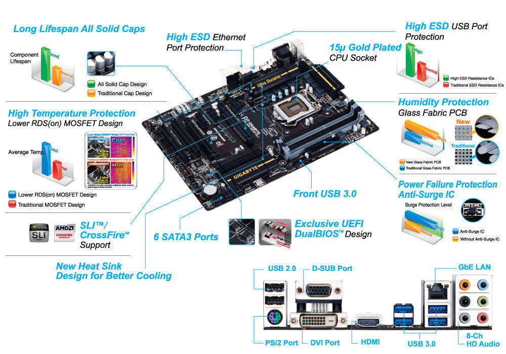 Gigabyte GA-Z87X-SLI оснащается сокетом LGA1150 для процессоров Intel Core 4-го поколения, четырьмя слотами для оперативной памяти DDR3-1333/1600, парой разъемов PCI Express 3.0 x16 (SLI/CrossFireX по формуле x8+x8), шестью портами SATA 6 Гбит/с с поддержкой RAID-массивов уровней 0, 1, 5 и 10, гигабитным сетевым контроллером и аудиокодеком Realtek ALC892. Отметим также наличие двух слотов PCI, трех PCI-E 2.0 x1, штырькового разъема USB 3.0 и четырех разъемов для подключения вентиляторов.