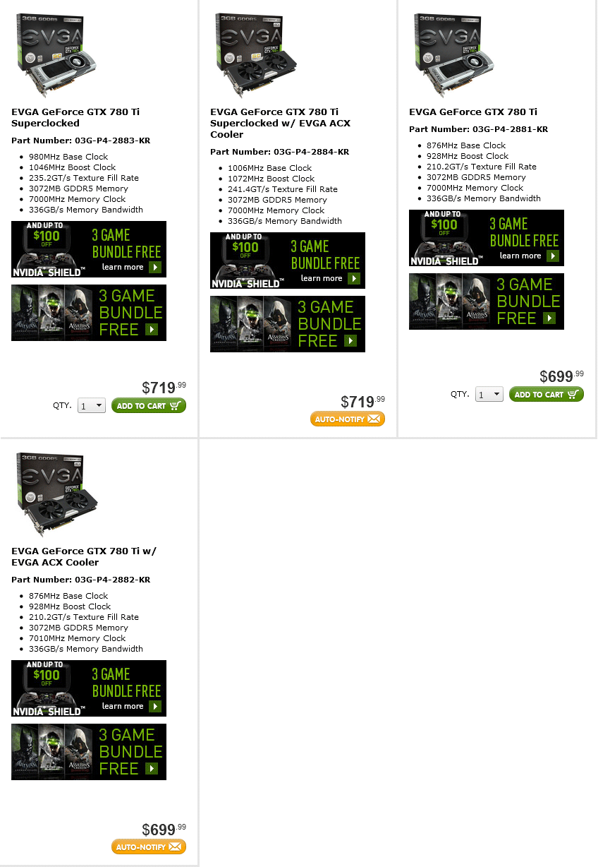 - EVGA GeForce GTX 780 Ti Superclocked ACX: 1006(1072)/7000 МГц, цена $720.