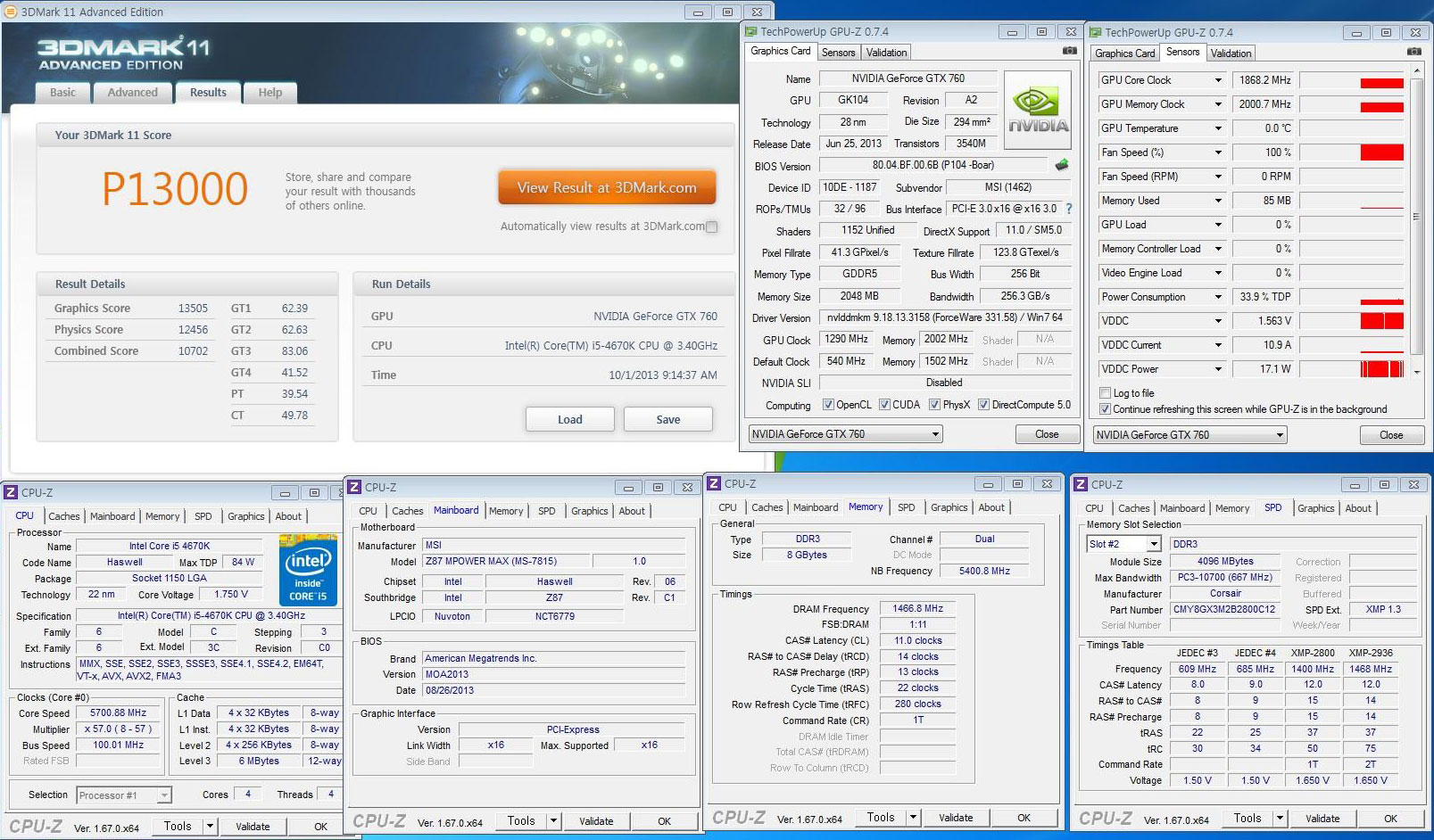 От ближайшего преследователя в дисциплине 3DMark 11 (Performance) oc_windforce оторвался на 664 очка. В составе экспериментального стенда были задействованы: материнская плата MSI Z87 MPower Max, разогнанный до 5700 МГц процессор Intel Core i5-4670K, двухканальный комплект оперативной памяти Corsair Vengeance Pro DDR3 @2934 МГц, блок питания Cooler Master Silent Pro Hybrid 1300W и вышеупомянутый видеоускоритель MSI N760 Hawk. Фото и видео смотрите ниже: