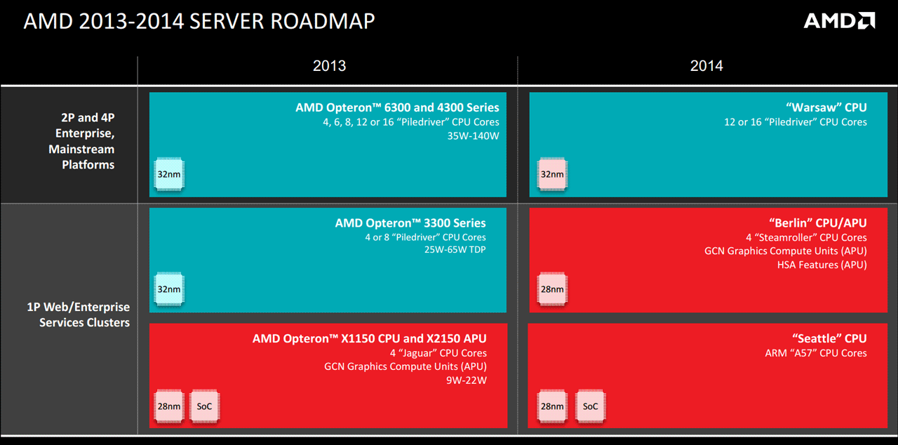 На серверном фронте AMD также не предложит альтернативу 12- и 16-ядерным Piledriver. Изменения в архитектуре если и будут, то крайне несущественные. Процессор с кодовым именем Berlin больше относится к APU, нежели к CPU, и является «родственником» настольных Kaveri.