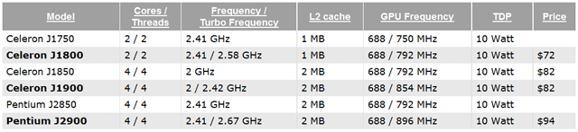 Серию возглавляет четырехъядерный Pentium J2900 с частотой 2,41 ГГц (2,67 ГГц в турборежиме). Он обладает 2 МБ кэш-памяти второго уровня, графическим блоком Intel HD (688/896 МГц) и двухканальным контроллером оперативной памяти DDR3L-1333 (поддерживается до 8 ГБ ОЗУ). Тепловой пакет Pentium J2900 составляет 10 Вт, рекомендованная цена — $94.