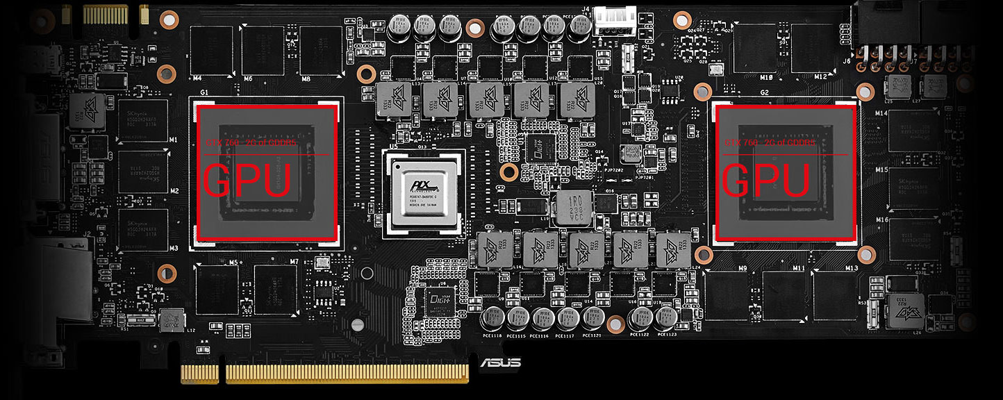 Львиную долю электропитания (до 300 Вт) обеспечивают 8-контактные разъемы PCI-E Power. Кроме прочего, у ROG Mars 760 есть один разъем SLI. Длина устройства не превышает 28 см.
