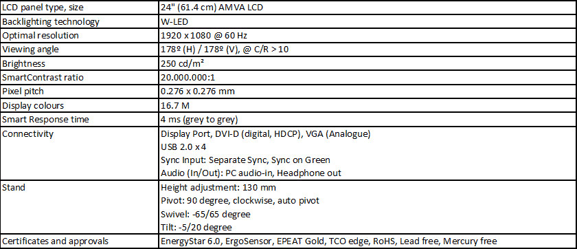 Диагональ экрана модели Philips 241P4QRYES составляет 61,4 см, паспортное разрешение — 1920 x 1080 точек, частота обновления — 60 Гц. Углы обзора достигают 178° по горизонтали и вертикали, время отклика — 4 мс (от серого к серому). Дисплей использует экономичную светодиодную подсветку; максимальные уровни яркости и динамической контрастности достигают 250 кд/м2 и 20 млн к 1 соответственно. В корпус монитора встроены интерфейсы DisplayPort, DVI-D и D-Sub (VGA), а также четыре порта USB 2.0.
