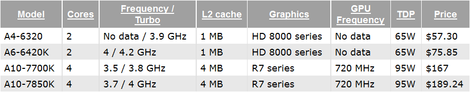 Два процессора относятся к семейству Richland. AMD A4-6320 и A6-6420K имеют в своем составе один модуль Piledriver (два x86-64 ядра), 1 МБ кэш-памяти второго уровня, графическую подсистему Radeon HD 8000 (VLIW4) и тепловой пакет в 65 Вт. Чип A4-6320 работает на частоте 3900 МГц в турборежиме и оценивается в $57, а A6-6420K (4,0/4,2 ГГц) с разблокированным на повышение множителем пока стоит $76. Данные APU можно устанавливать в материнские платы с сокетами FM2 и FM2+.