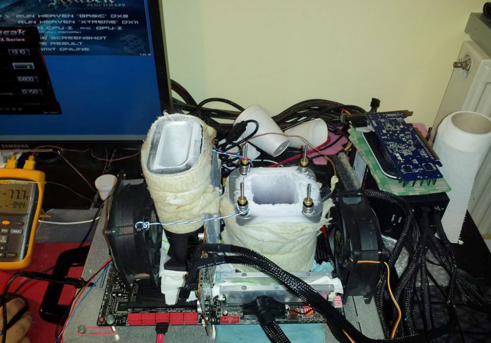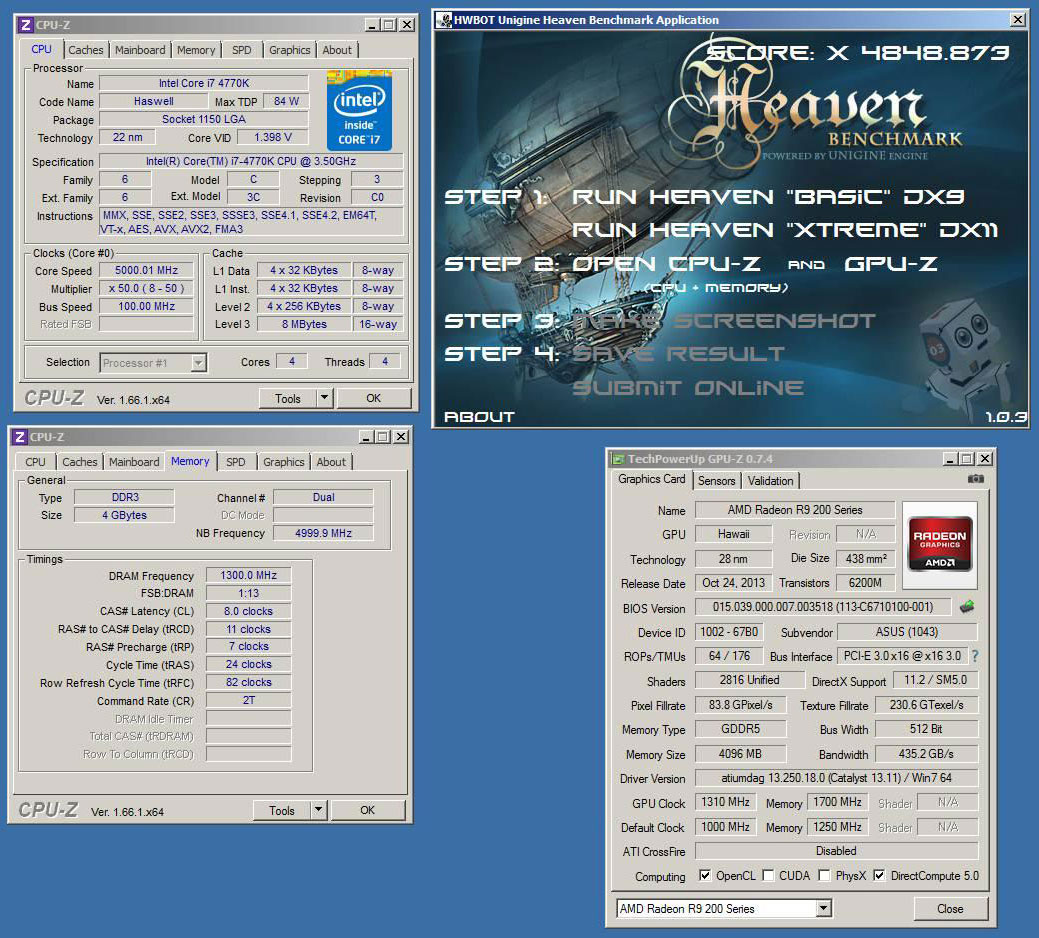 Для лучшего результата в Heaven DX11 греческому энтузиасту потребовалось разогнать чип Hawaii XT до 1310 МГц и память GDDR5 до 6800 МГц. Частота процессора Intel Core i7-4770K составляла всего 5 ГГц (как известно, для Unigine Heaven не требуется мощный CPU), функция Hyper-Threading была отключена. На процессоре и видеокарте устанавливались испарители для жидкого азота.