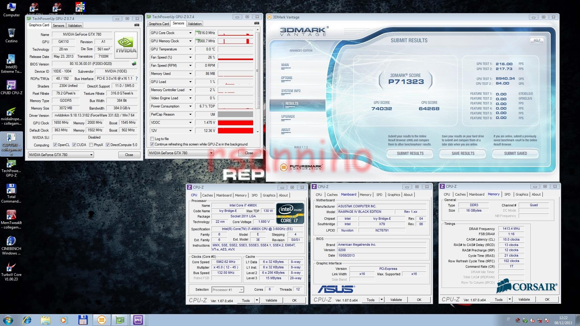 Рекорд в 3DMark Vantage на единичном адаптере GeForce GTX 780 отныне принадлежит итальянцу rsannino — 71323 очка. Карта Asus GTX 780 DirectCU II подверглась вольтмоду и была разогнана до частот 1816/8000 МГц (ядро/память). Компанию ей составили: процессор Intel Core i7-4960X (@5962 МГц), материнская плата Asus Rampage IV Black Edition (X79), 16 ГБ (4 x 4 ГБ) оперативной памяти Corsair Dominator Platinum и блок питания Enermax Platimax 1350W.