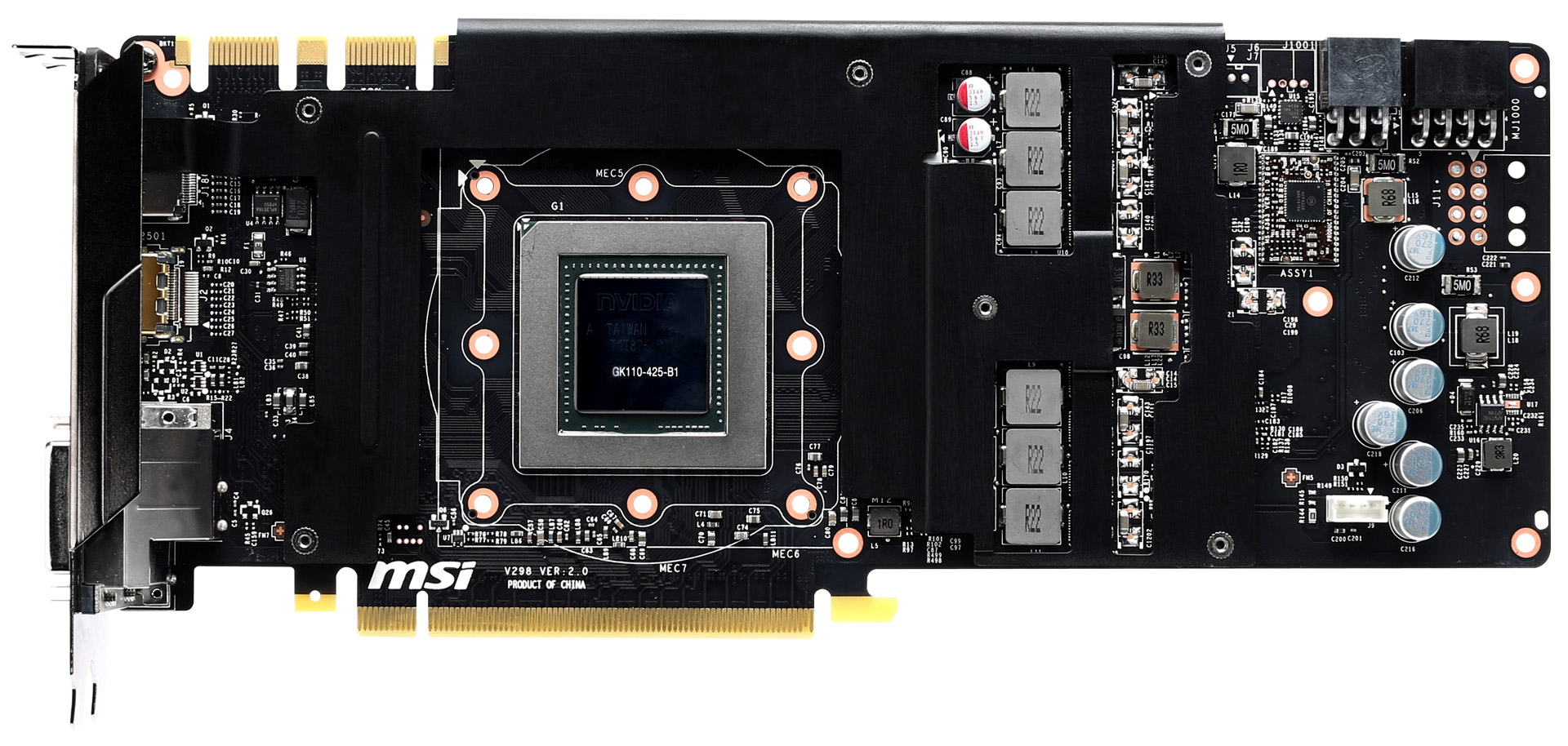 На плате имеются разъемы питания PCI-E Power на 6 и 8 контактов, два разъема SLI, видеовыходы Dual-Link DVI-I, Dual-Link DVI-D, HDMI и DisplayPort. Общая длина устройства составляет 266 мм, ширина — 129 мм