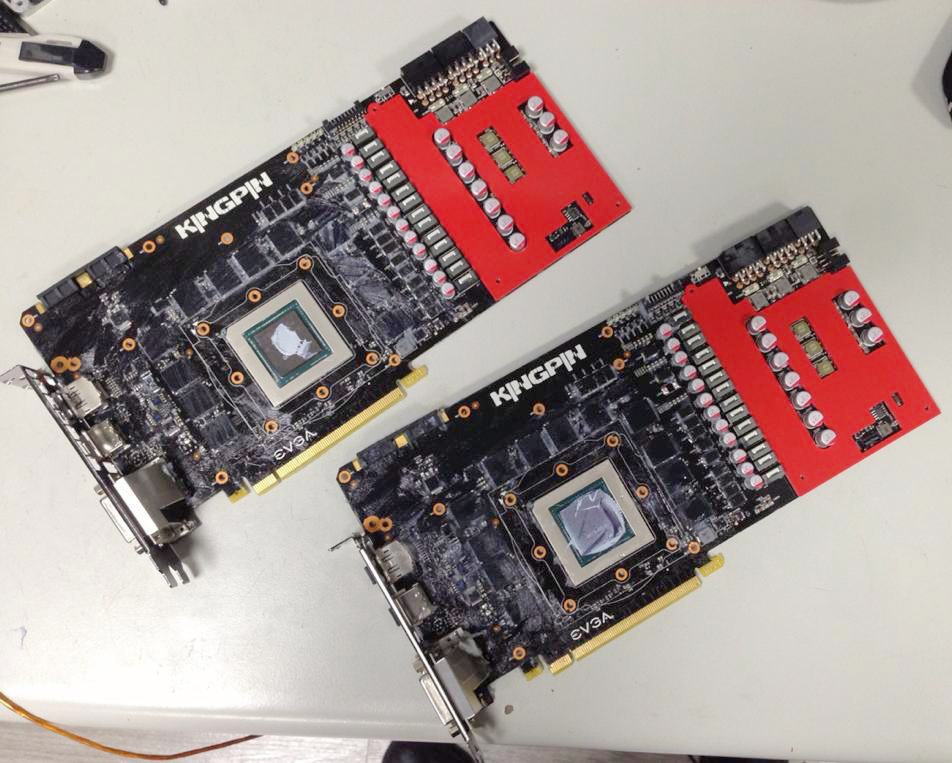 На фото ниже изображены предрелизные экземпляры EVGA GTX 780 Ti Classified KPE с радиатором системы питания красного цвета. На платах распаяны два разъема PCI-E Power на 8 контактов, один на 6 контактов, доступна пара SLI и единичный разъем EVBot. Примерное количество фаз питания GPU — 14.
