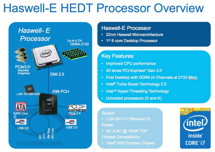 Предварительно, в числе первых процессоров Haswell-E будут 8-ядерный Core i7-5960X и 6-ядерный Core i7-5930K. Последний будет иметь меньший объем кэша третьего уровня (15 МБ).