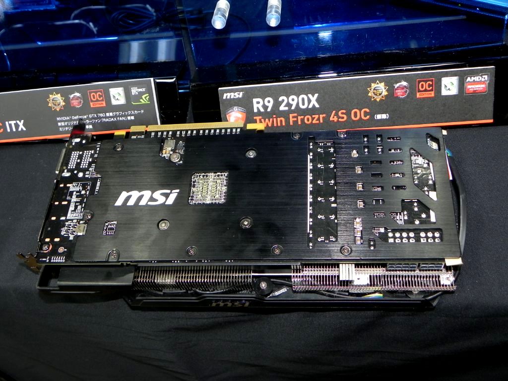 Если сравнить фото Gaming-версий Radeon R9 290X и GeForce GTX 780 Ti от Micro-Star, то отчетливо видно, что система охлаждения R9 290X включает более широкий алюминиевый радиатор, который обдувается двумя 100-мм вентиляторами. Точной информации о количестве тепловых трубок пока нет.