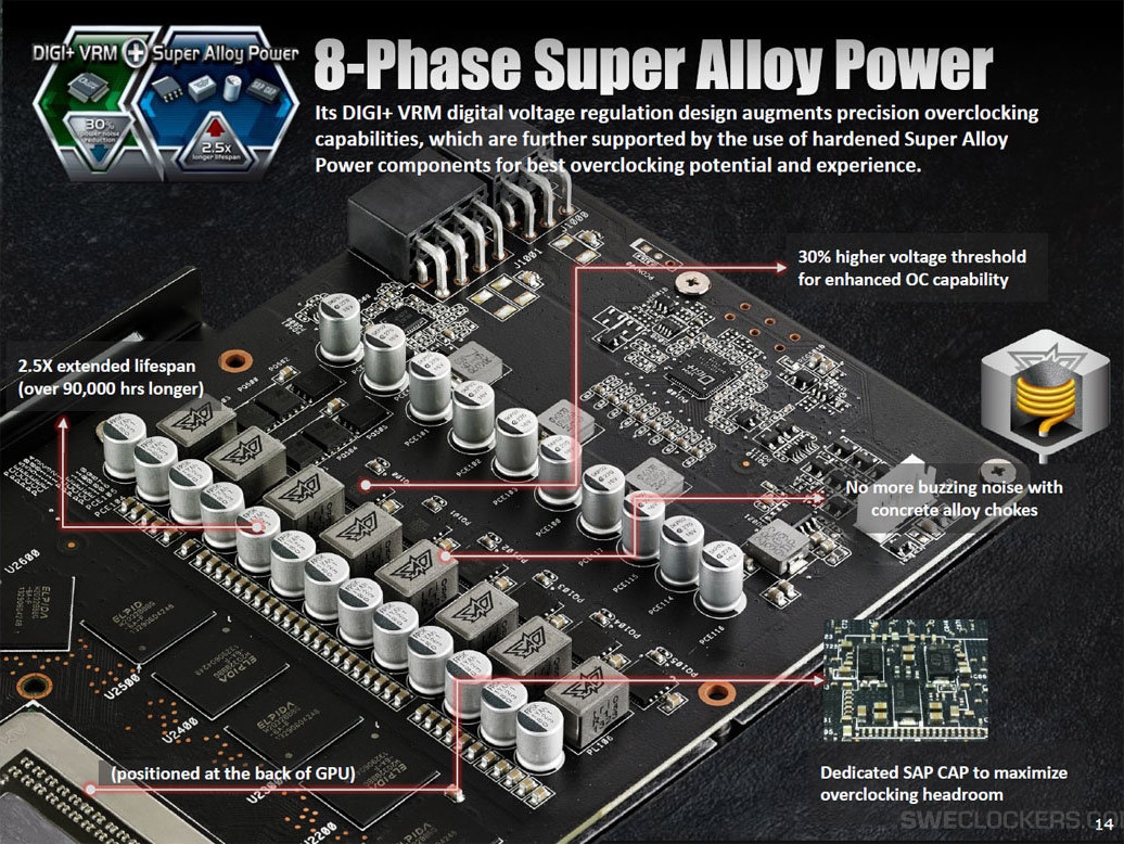 Система питания выглядит гораздо солиднее, чем у конкурирующего решения MSI: задействованы восемь силовых фаз с применением высококачественных узлов Super Alloy Power и ШИМ-контроллера Digi+. Подача дополнительной мощности осуществляется через 6- и 8-контактный разъемы PCI-E Power. Вокруг графического процессора AMD Hawaii XT (2816 шейдеров, шина памяти 512-бит) распаяны микросхемы буферной памяти Elpida GDDR5 суммарным объемом 4 ГБ. Номинальные частоты видеокарты составляют 1050/5400 МГц для ядра (в турборежиме) и чипов памяти соответственно.