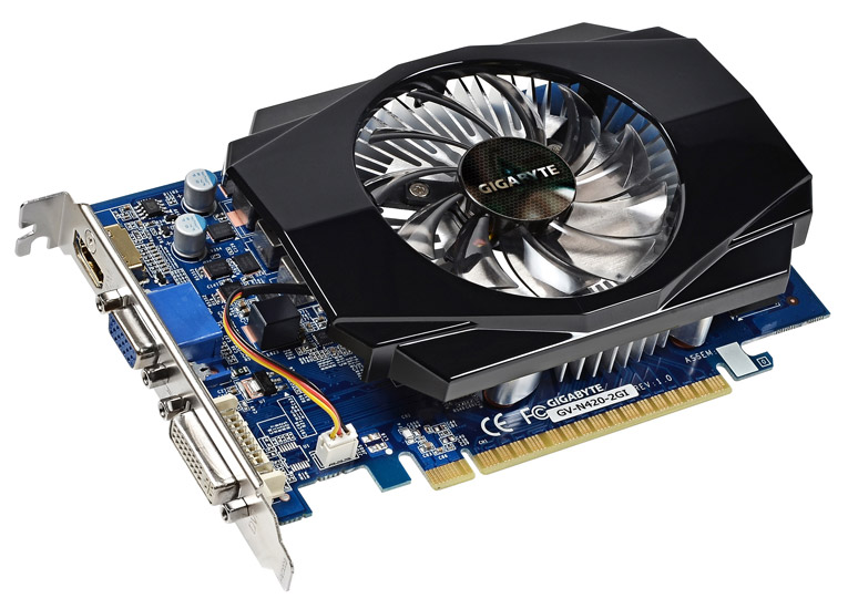 В спецификации Gigabyte GV-N420-2GI указано, что графический чип выполнен по 28-нм техпроцессу и поддерживает API DirectX 11.1. Эти данные, на наш взгляд, сомнительны, особенно учитывая, что линейка GeForce 400 включает только DX11-совместимые модели на базе 40-нм ядер Fermi. Исключением является лишь OEM-видеоадаптер GeForce 405 (Tesla GT218, DirectX 10.1).
