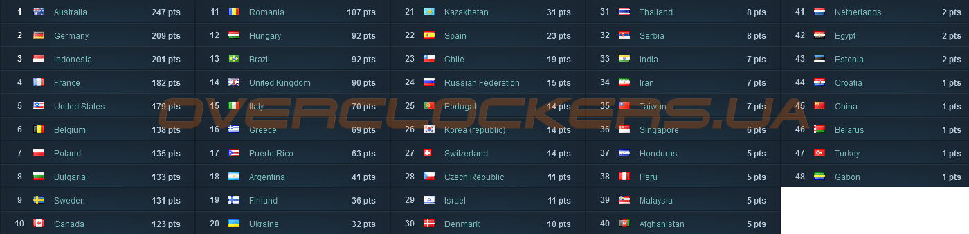 Американцы даже какое-то время лидировали, но в итоге позволили обогнать себя остальной четверке. Борьба фактически завершилась на предпоследнем этапе, когда Австралия завоевала четвертое «золото». Зеленый континент занял первые места в дисциплинах 3DMark Cloud Gate, 3DMark 11 (Performance), 3DMark Vantage 2x GPU, HWBot Prime, 3DMark03 и завоевал «серебро» в SuperPi 32M.