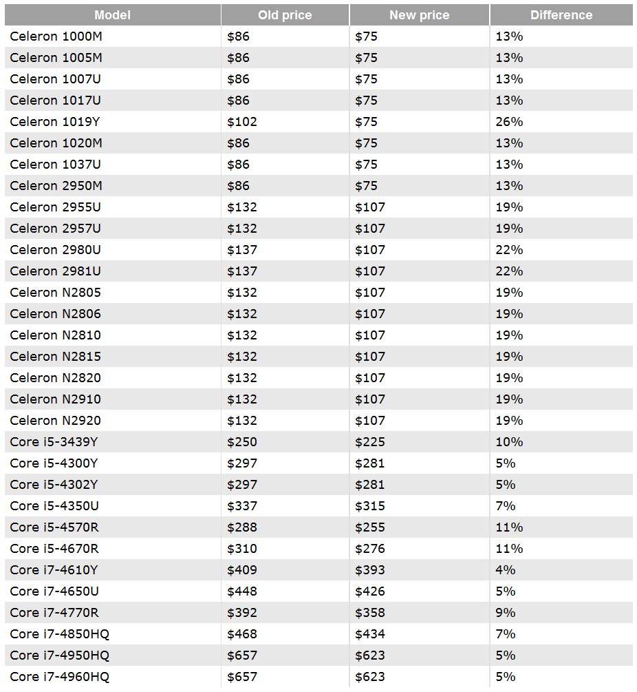 В процентном отношении больше всех «сбросили» двухъядерные Intel Celeron 1019Y (стоимость снизилась на 26%), Celeron 2980U (22%) и Celeron 2981U (22%). На целых 34 доллара стали дешевле Core i5-4670R, Core i7-4770R, Core i7-4850HQ, Core i7-4950HQ и Core i7-4960HQ. Бюджетные Celeron 1000M, 1005M, 1020M, 2950M, 1007U, 1017U и 1037U предлагаются теперь по $75, а не по $86, как раньше.
