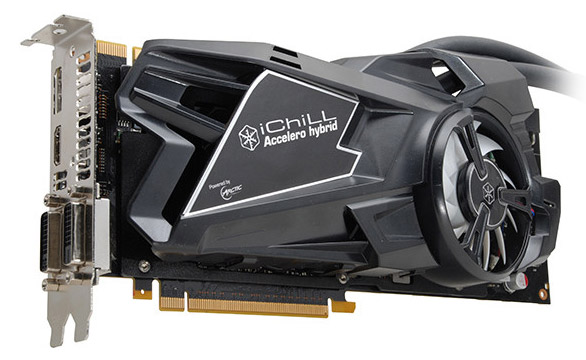 Карта iChill GTX 780 Ti Accelero Hybrid имеет в своем арсенале 2880 потоковых процессоров, 384-битную шину памяти и 3 ГБ ОЗУ типа GDDR5. Частоты ядра и памяти данной модели повышены с 875(928)/7000 МГц до ~1085/7280 МГц. Видеоускоритель располагает двумя разъемами SLI, интерфейсами вывода изображения DisplayPort, HDMI, DVI-I и DVI-D.