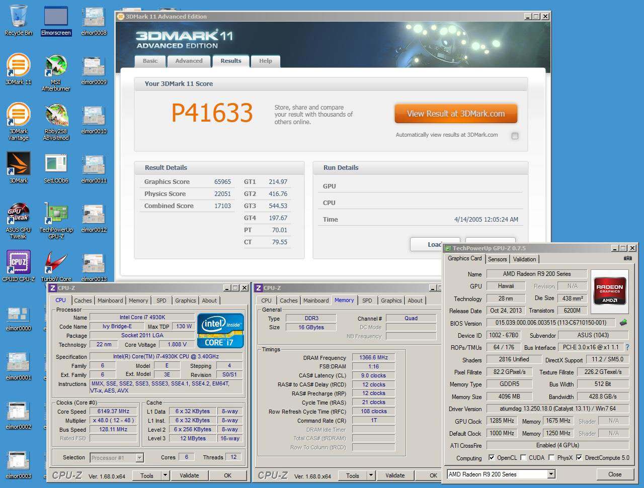Четыре видеокарты Asus Radeon R9 290X и процессор Intel Core i7-4930K были разогнаны под жидким азотом до 1285/6700 МГц и 6150 МГц соответственно. В системе также были задействованы четыре модуля оперативной памяти Corsair Platinum DDR3 @2733 МГц и 1200-ваттный блок питания Super Flower Leadex Platinum.